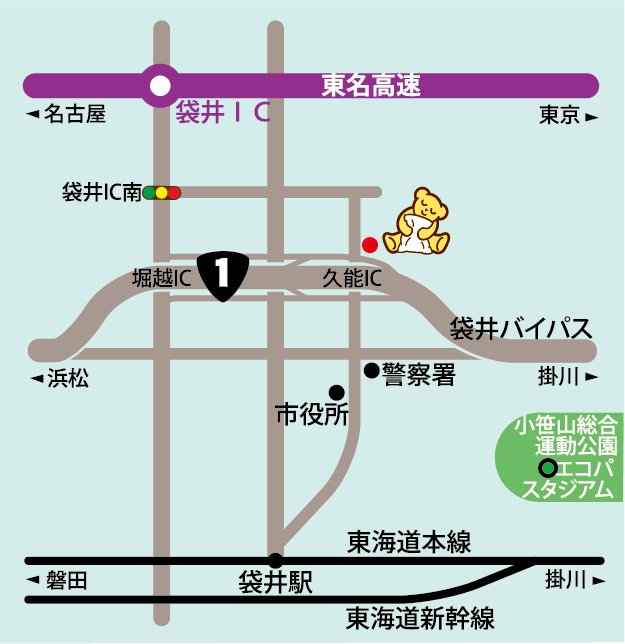 国道1号線(袋井バイパス)久能IC下車、交差点脇。東名高速・袋井ICから2.2km。