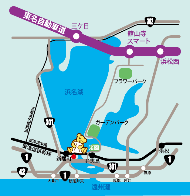 浜名湖の南側を走る国道301号沿い。浜名湖北側の東名高速浜松西ICから約17km、舘山寺スマートICから約17km、三ケ日ICからは約22km。浜松中心地へは約15km。