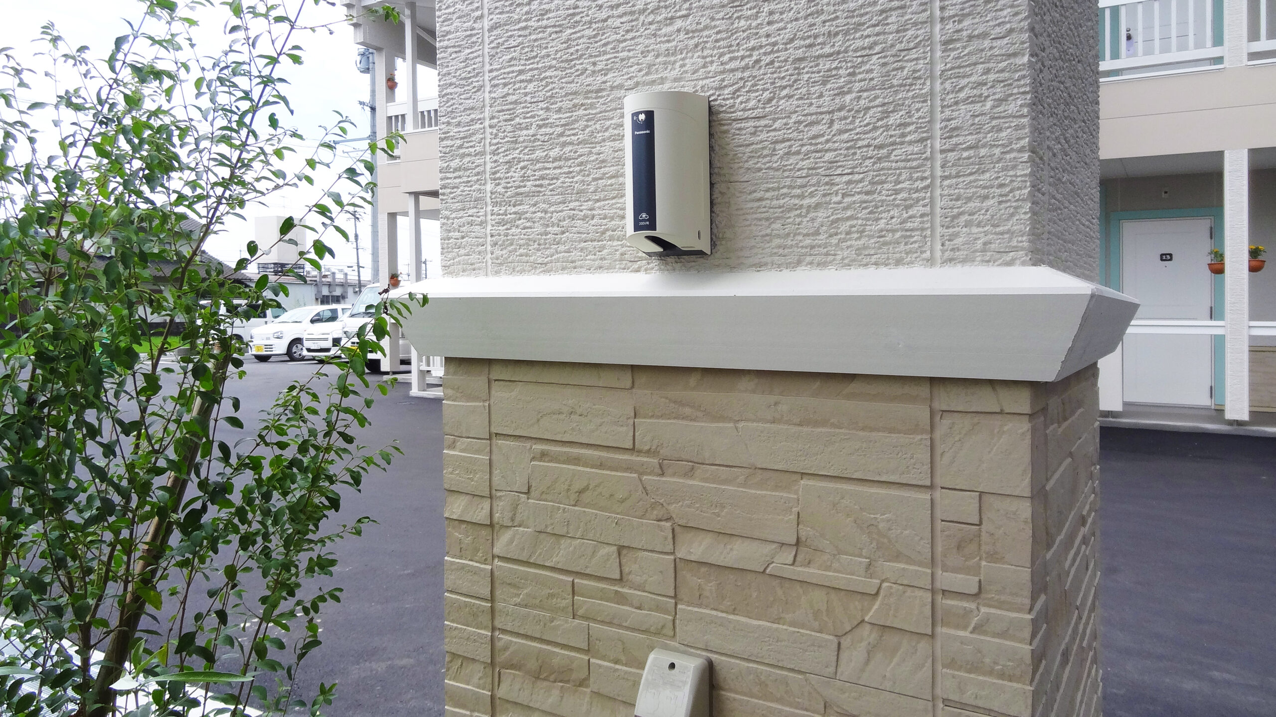EV(電気自動車) 用の200V通常充電用コンセントを車寄せの柱に設けております。