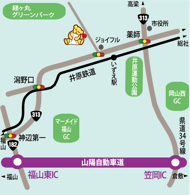 山陽道・ 福山東インターより、国道182号、国道313号経由で約13km。