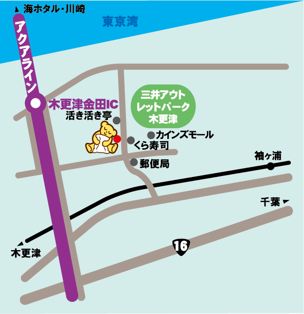 アクアライン「木更津金田IC」下車、側道を約1km進み左折、500m先郵便局のある交差点を左折、左側。