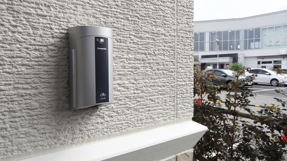 EV(電気自動車) 用の200V通常充電用コンセントを車寄せの柱に設けております。