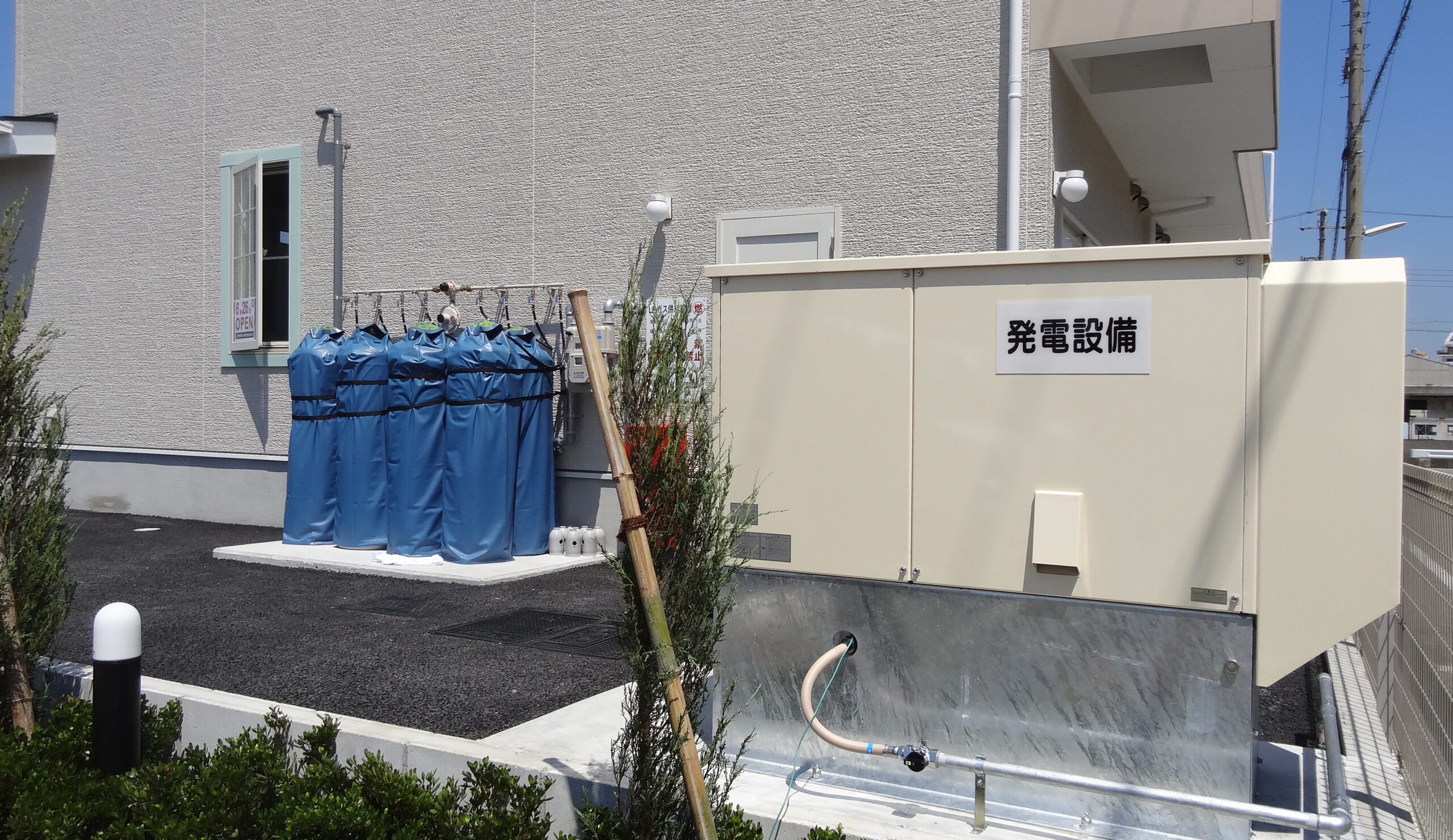 万一停電の際は、自動的に発電機が起動し、LPGをエネルギー源とし、少なくとも数日は 電気を供給します。