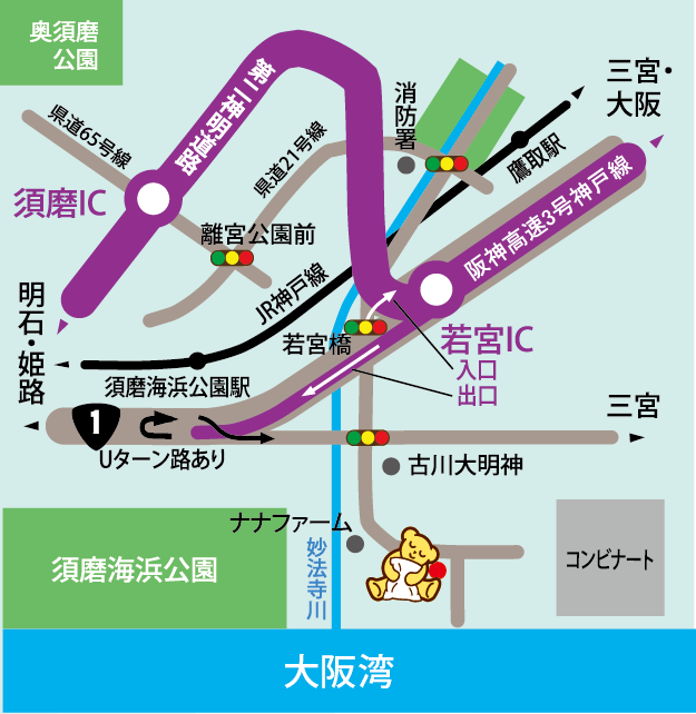 第二神明道路・須磨ICより、県道65号線・21号線経由で約10分、約3.5km。