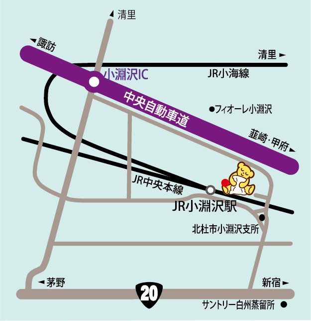 JR中央本線「小淵沢駅」より、徒歩約5分。駅には南口しかありません。駅東側の跨線橋を渡って左側、駅の東北側の線路脇に回ってください。新宿駅から特急「あずさ」で約2時間です。
