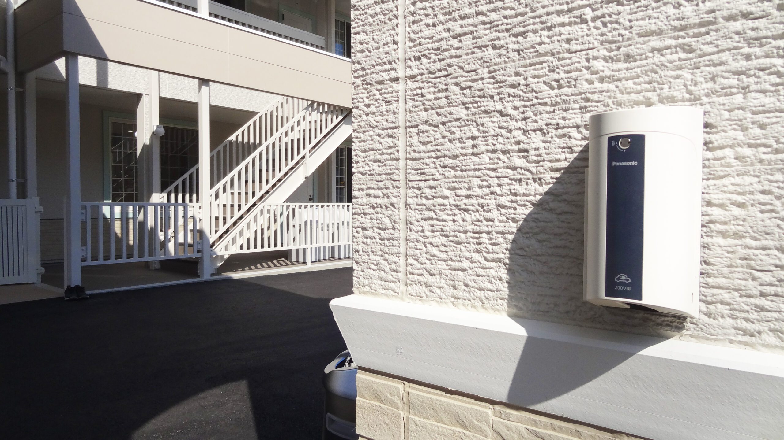 EV(電気自動車) 用の200V通常充電用コンセントを車寄せの柱に設けております。