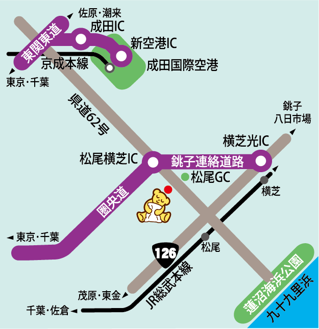 東関東自動車道成田ICから、国道295号線へ出て、寺台インターへ向かってください。首都圏中央連絡自動車道(圏央道)にてお越しの方は、大栄JCTで東関東自動車道に乗り継ぎ、成田ICでお降りください。