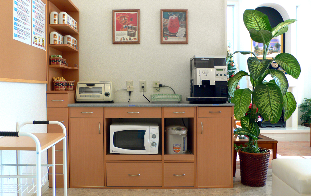 ラウンジに電子レンジ、ポット、トースターをご用意しています。フロントの営業中は、ご自由にご利用ください。
