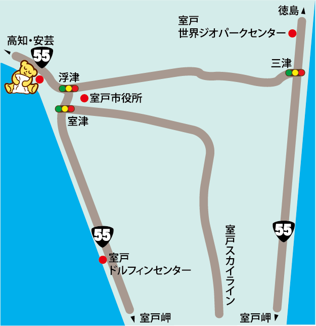 高知東部道・芸西西ICから50km、国道55号沿い。室戸市中心部へ約1km。