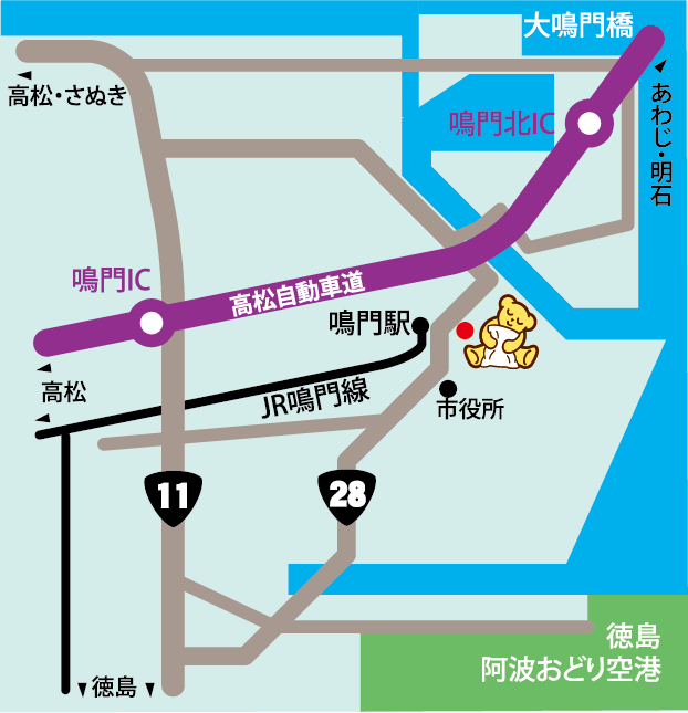 高松道・鳴門ICから4.5km、鳴門北ICから6.5km。徳島空港から8km。国道28号沿い。鳴門駅斜め前。