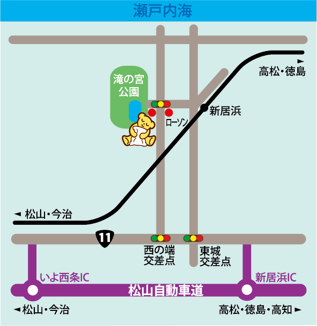 松山自動車道「新居浜IC」から約6km、「いよ西条IC」から約6km。滝の宮公園そば。