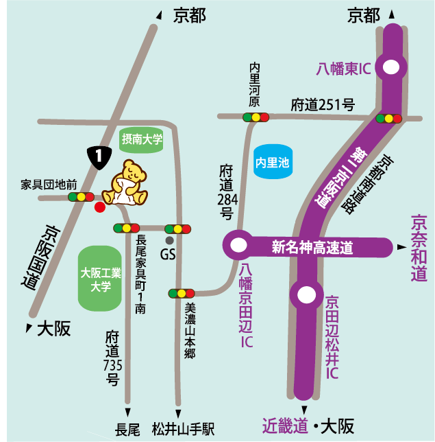 国道1号(京阪国道)からは、「家具団地前」信号より東へ約100m。