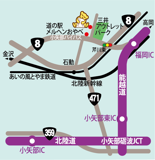能越道「福岡IC」から約3.5km。「三井アウトレットパーク北陸小矢部」向かい、
