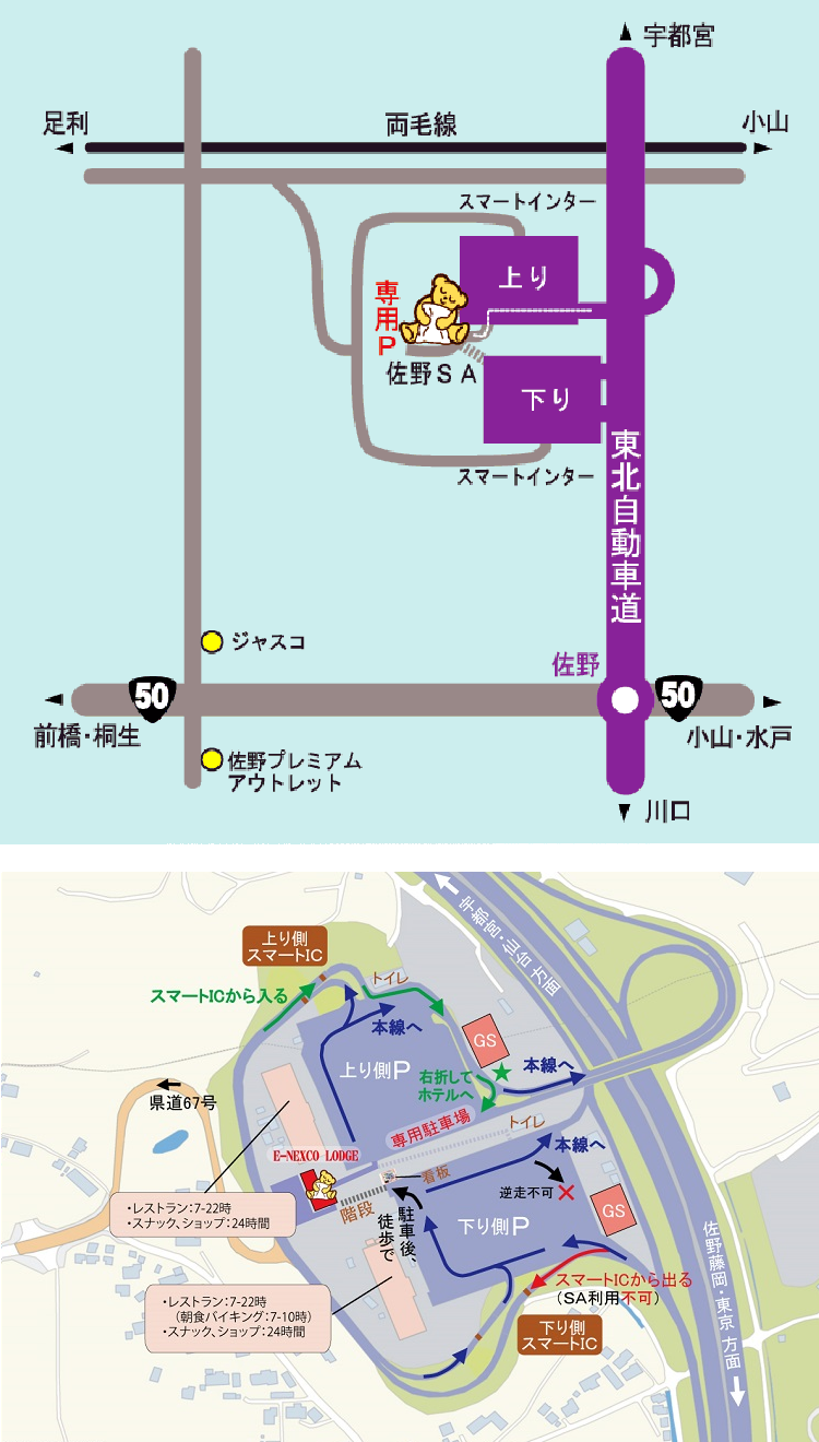 「佐野SA店」は、佐野サービスエリアの上り側敷地内にありますが、下り側にも隣接しているため、両方向からご利用いただけます。