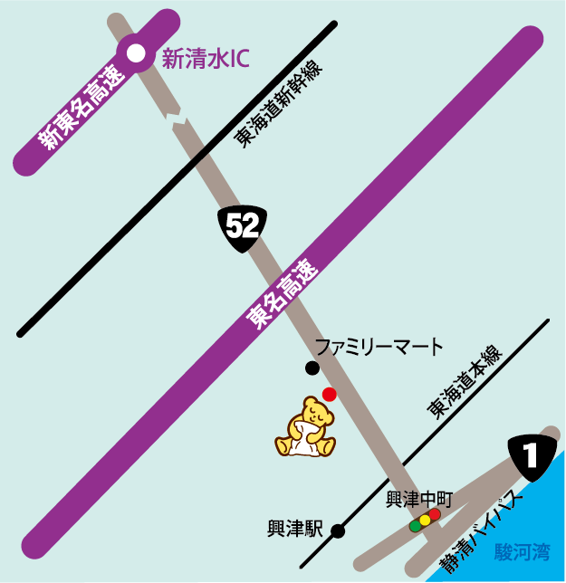 国道1号線から800m、「興津駅」から約1.1km。清水中心部へも7km足らずで、ビジネスにも便利です。