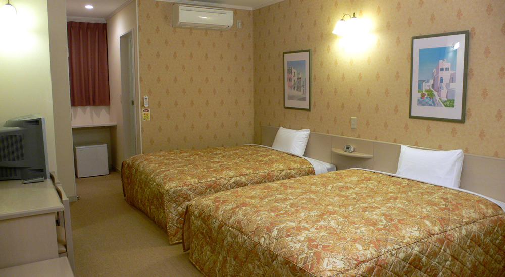 全室にクイーンサイズベッドを2台設置しております。ひとつのベッドが幅154cmでダブルベッドより一回り大きいサイズですので、それぞれに2名は十分お休みいただけます。したがって、1名からご家族4~6人まで1室でお泊りいただけますが、ご希望により、エキストラベッド(シングルサイズ)をご用意させていただきます(1台2,200円/1泊)。
