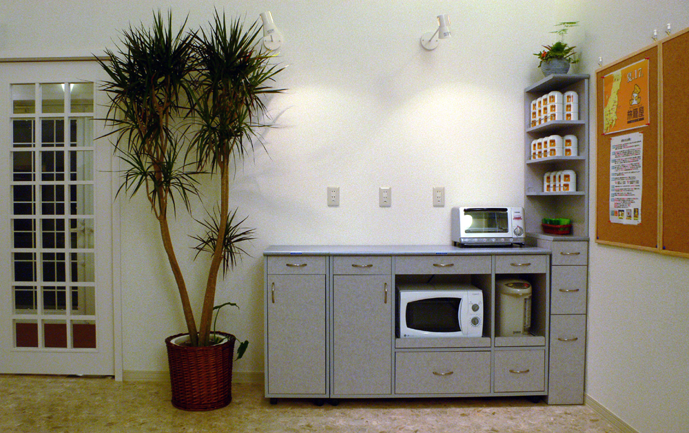 ラウンジに電子レンジ、ポット、トースターをご用意しています。フロントの営業中は、ご自由にご利用ください。