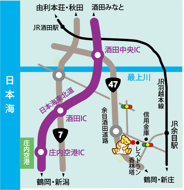 日本海東北自動車道「酒田中央IC」より、国道47号経由で約7.8km。