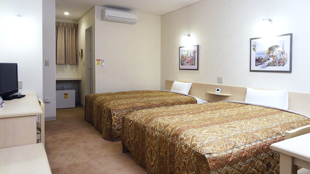 全室にクイーンサイズベッドを2台設置しております。ひとつのベッドが幅154cmでダブルベッドより一回り大きいサイズですので、それぞれに2名は十分お休みいただけます。したがって、1名からご家族4~6人まで1室でお泊りいただけますが、ご希望により、エキストラベッド(シングルサイズ)をご用意させていただきます(1台2,200円/1泊)。