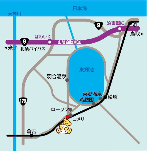 国道9号線(青谷羽合道路)泊東郷ICより県道22号線に入り、倉吉方面へ約8.5km、左側。