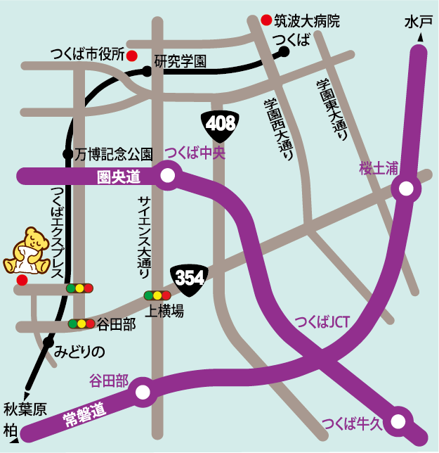 常磐自動車道「谷田部IC」から約5km、圏央道「つくば中央IC」から約5.5km。