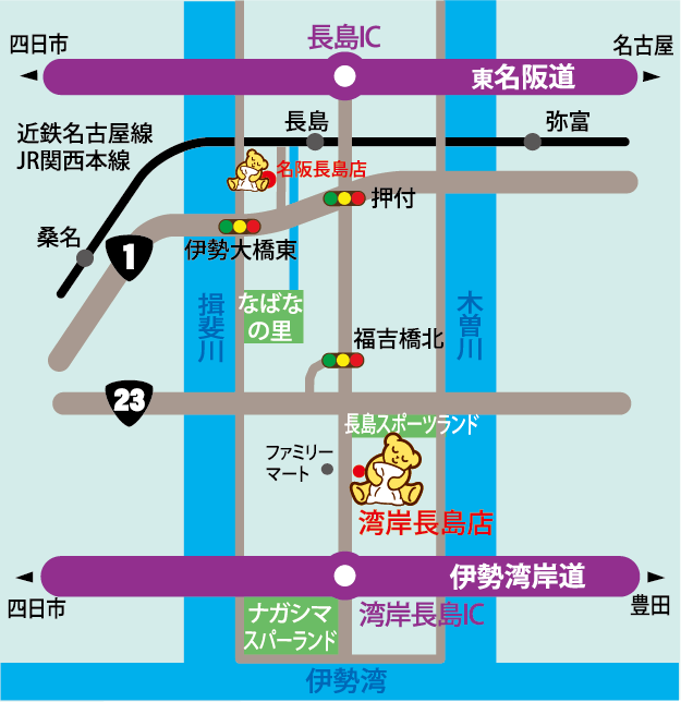 東名阪・長島ICと伊勢湾岸道・湾岸長島ICを結ぶ県道7号線沿い。長島スパーランド近く。